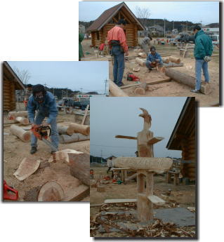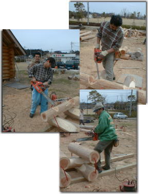 | かたや、今回メインの展示台の作成の総責任を負わされてしまった栗田先生。 國明師匠からの要望を頭に描いて、それを具現化していきます。見事な感性とチェーンソーワークで見る見るうちに鷹の展示台が出来あがっていきます。 栗田先生のポリシーどうり、機械加工されているところはひとつもない、見事なカービングスタンド。 流石は「ハンドクラフトマン」の異名を誇る栗田先生でした。 週末職人の作品は、この素晴らしい展示台に堂々と飾られていたのであります。 |