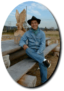 黒のカーボーイハットにジージャン姿でチェーンソーを自分の腕の様に操る