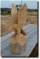 | 栗田師匠のカービングの妙技は一見の価値あり。まるで絵を書くかのように見る見るうちに刻んでいく様子は、見習の僕達をホウフツさせてくれます。 右の写真はものの15分ぐらいで作り上げてしまった「鷲」。僕はこの鷲を見習って小鳥のカービングに挑戦しましたが、ペンギンになってしまいました。 |