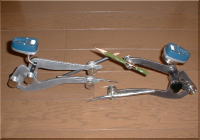 | スクライバー ログの重なり合う部分を写し書くログ用特殊コンパス。 5mmのアルミ版をジグソーで切り落とし、水準器を 取りつけました。右が「リキスクライバー」、 左が足の形をした「スケバイバー」 その他の紹介は |